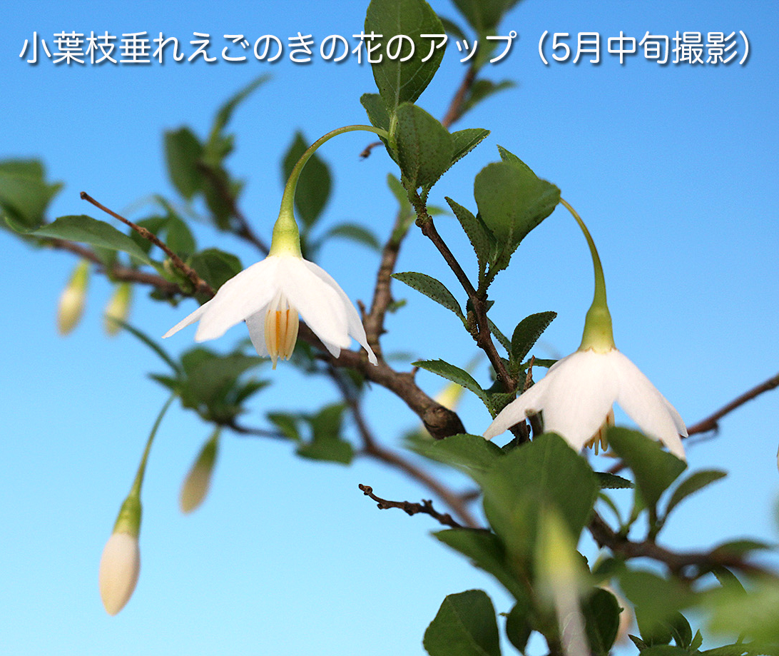 エゴノキ科の落葉小高木。初夏に咲く可憐な白もしくはピンクの花。夏に青白色に熟すドングリに似た果実は涼感を味わえます。丈夫で育てやすく、芽吹きがよく小枝がよくできます。また自然交配で実が付くので初心者にも楽しめる樹種です。