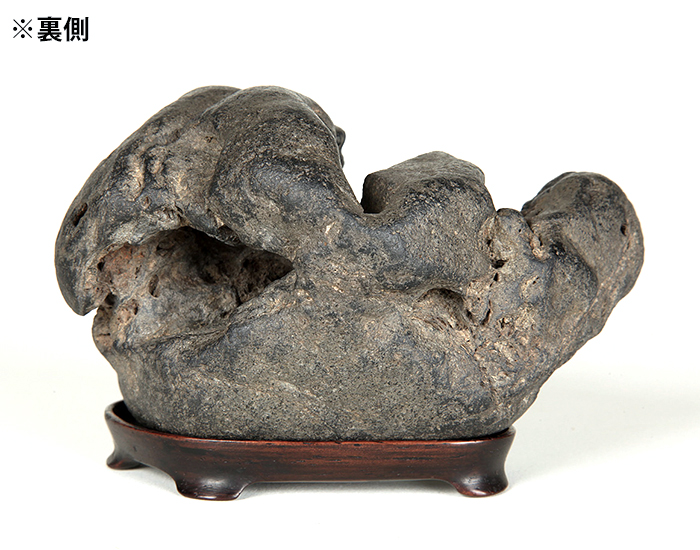 持ち込みの古さを感じさせる光沢ある石質が魅力の加茂川石。中央部に見る「抜け」や「窪み」が見所です。岩潟石として秀逸な形で、海辺の景色を楽しめる一石です。