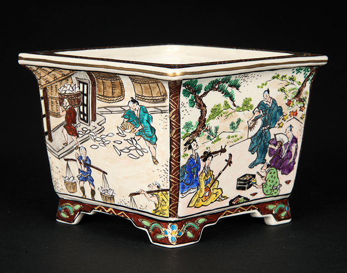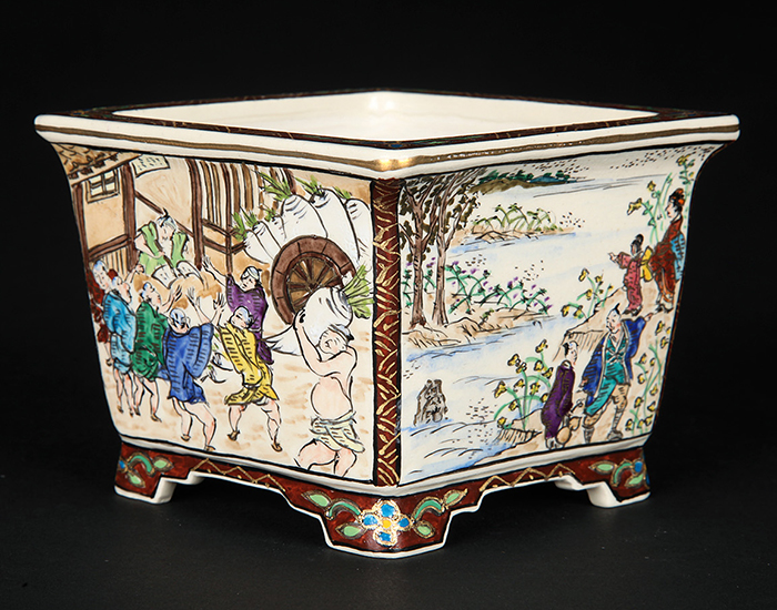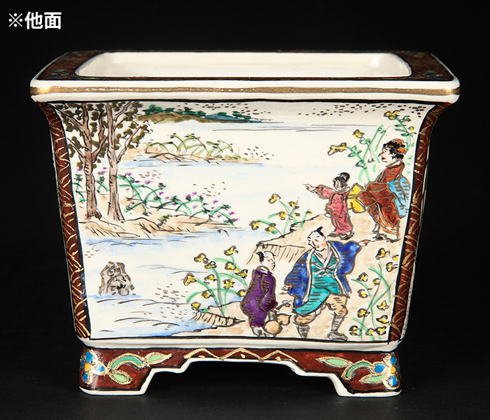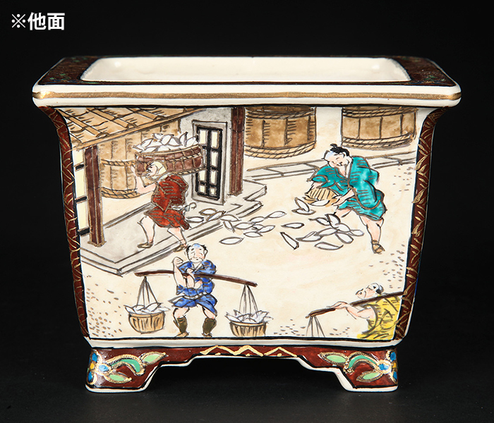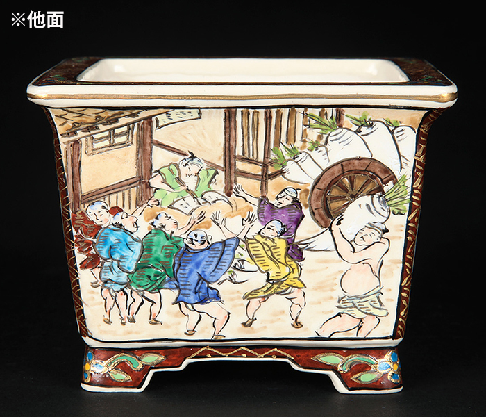 高さのあるやや小振りの正方鉢。市井の風景がユーモラスなタッチで四面に描かれており、どの面を正面に据えるか考えるのも面白い作品である。シリアルNO.192