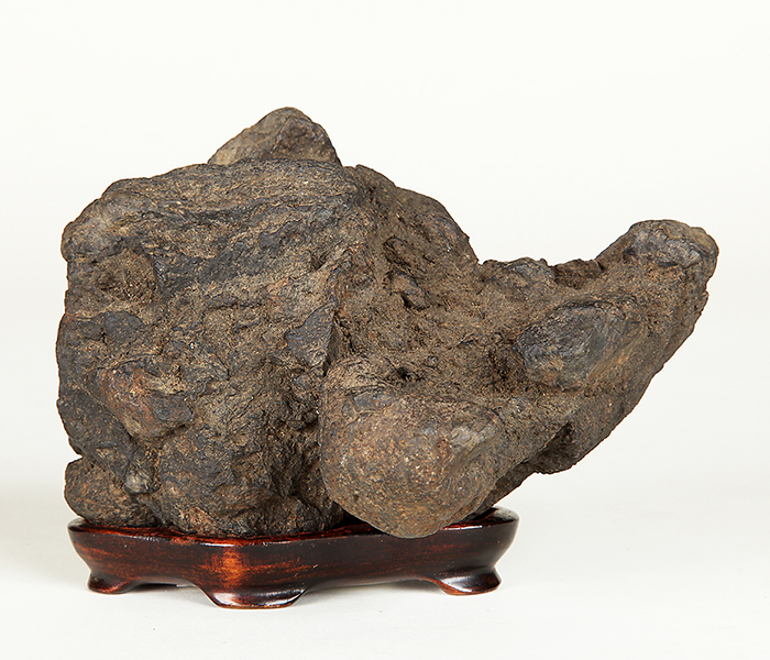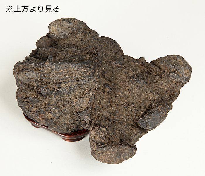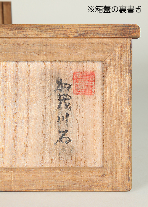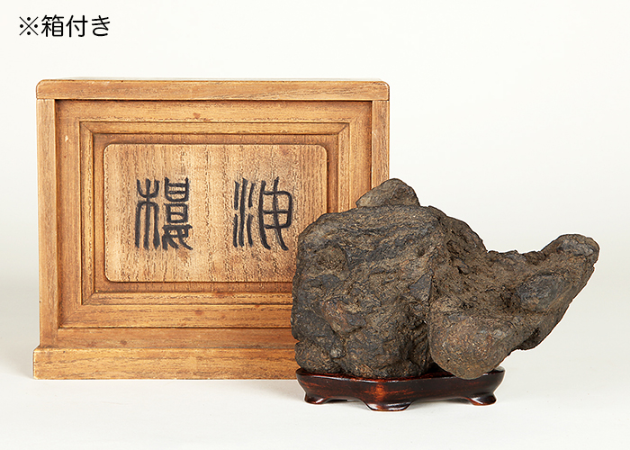 木箱に銘が記されているが篆刻の解読ができず、銘や見立ては不明。褐色の石質から鞍馬付近で採取された可能性も考えらます。小振りながら個性的な形状で岩潟石として見ることができるでしょう。海上に浮かぶ岩のさまを彷彿させます。持ち込みの古さを感じさせる風情が味わい深い逸品。底はウブだと思われます。