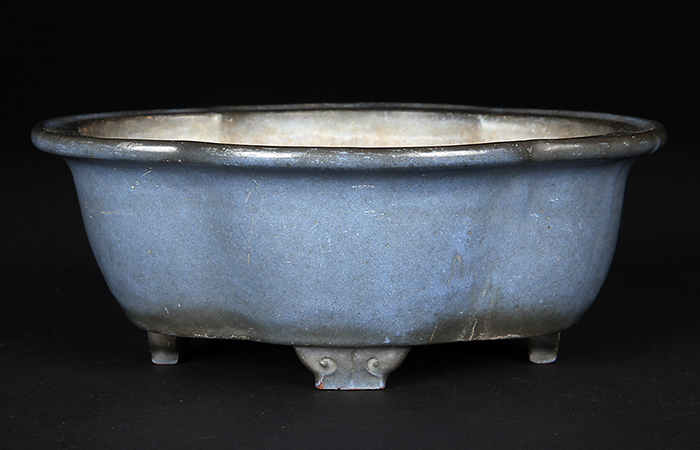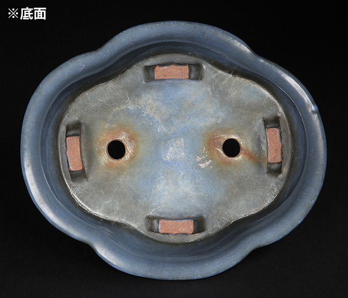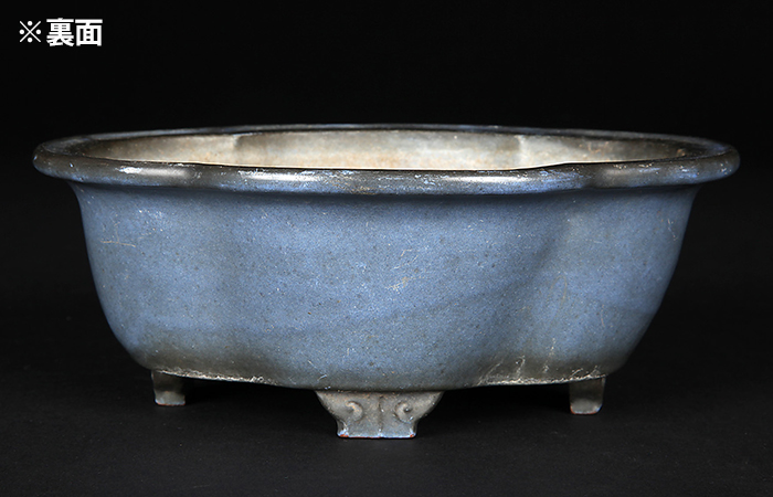 底部の丸い膨らみやたっぷりと余裕のある奥行、柔らかな印象の雲足細工で、樹を選ばずに合わせることができる高い実用性を備えた均釉の名品。焼成されて100年以上は経つ古鉢で長年の継承でしか得られない時代感が素晴らしい。古くから小品盆栽界では重宝されてきた鉢で、今の雅風展出品樹クラスにも対応する貴重な一枚。底面に施された釉薬で隠れて落款が不明瞭ですが、その作風や時代感から「鐡画軒製」だと思われます。まさに小品盆栽界歴証の実用名鉢と言えるでしょう。目立った傷はなく保存状態は良好。木箱付き。落款あり。