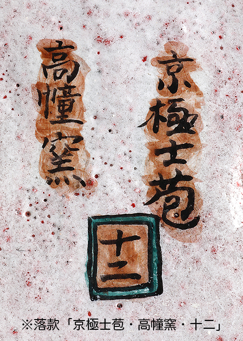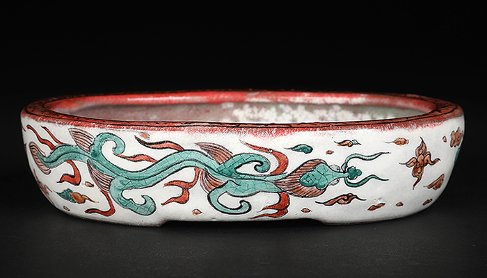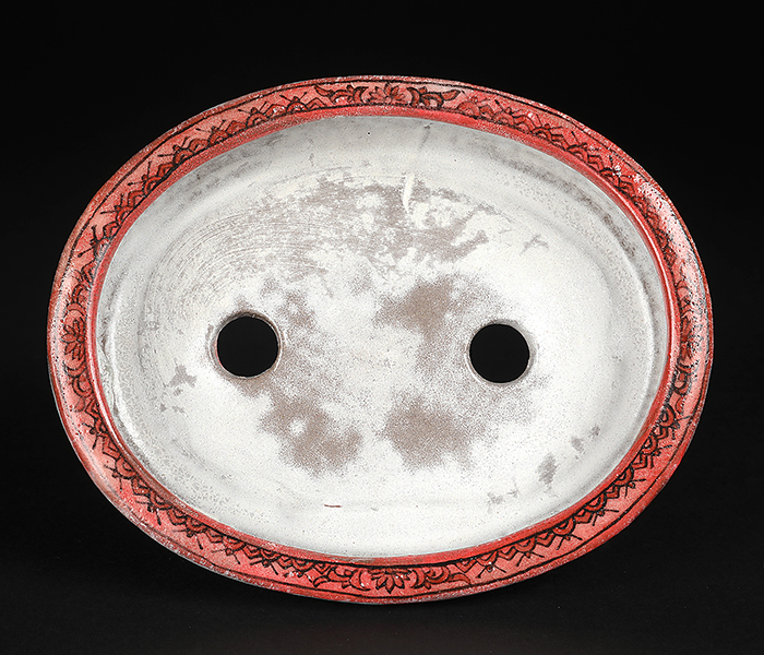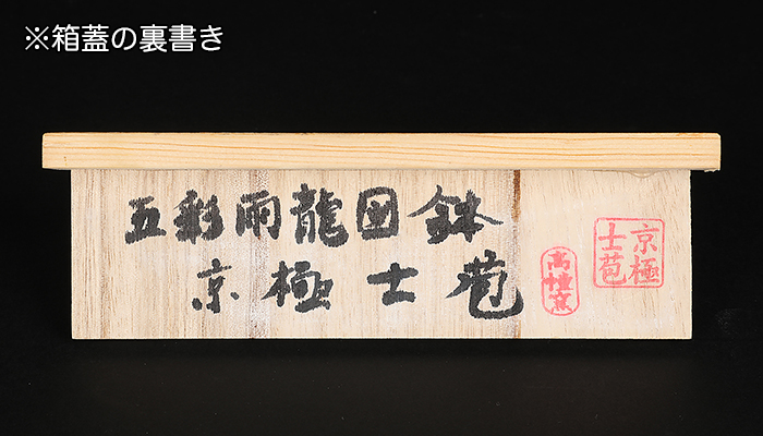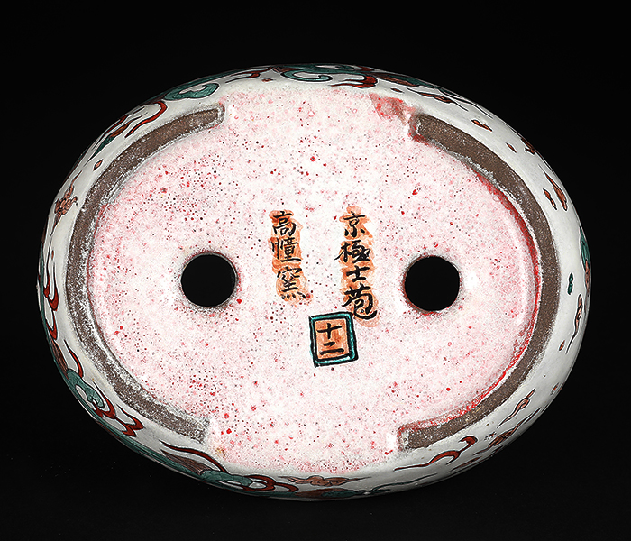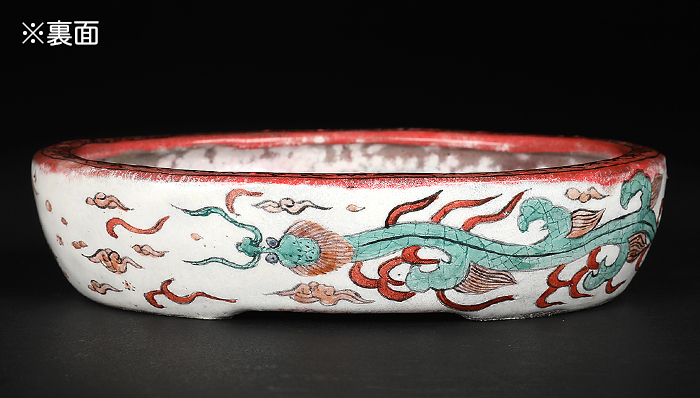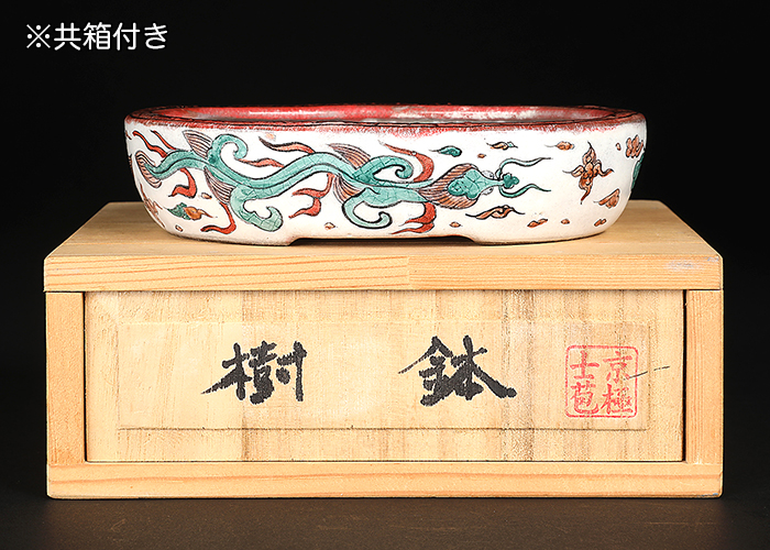 香川県の小品盆栽愛好家であり、古くから鉢作家としても活躍してきた京極士庖。古くは渋草が用い、かの涌泉も用いた「雨龍」を描いた作品。雨の恵みをもたらす聖獣・雨龍と瑞雲文が落ち着いた色調で描かれています。裏薬だけではなく内側にも釉薬が施された丁寧な作りで、樹を上品に引き立てる格調高い仕上がりです。京極士庖の屈指の力作と言えるでしょう。目立った傷はなく保存状態は良好です。共布・共箱付。落款:京極士苞・高幢窯・十二