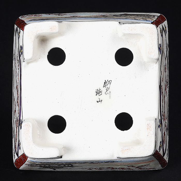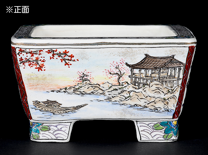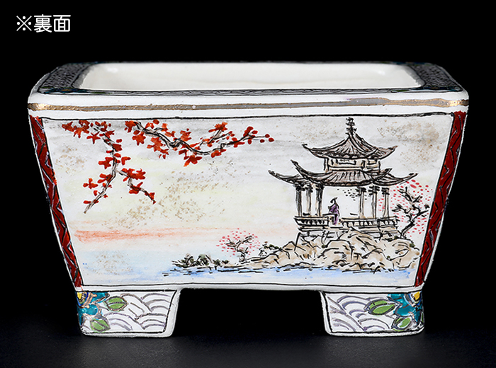 京薩摩の伝統に新風を吹き込み、国内外の盆栽愛好家から高い支持を集める陶工・柳戸川浩山の新作鉢。盆樹との調和を意識した落ち着いた色調で、さらに近年は薩摩焼伝統の図案から、名所旧跡や神社仏閣などの風景を取り入れるなど、新たな作風に挑戦。柳戸川浩山の新境地、この機会にお手元でご堪能下さい。落款:柳戸川浩山・他。