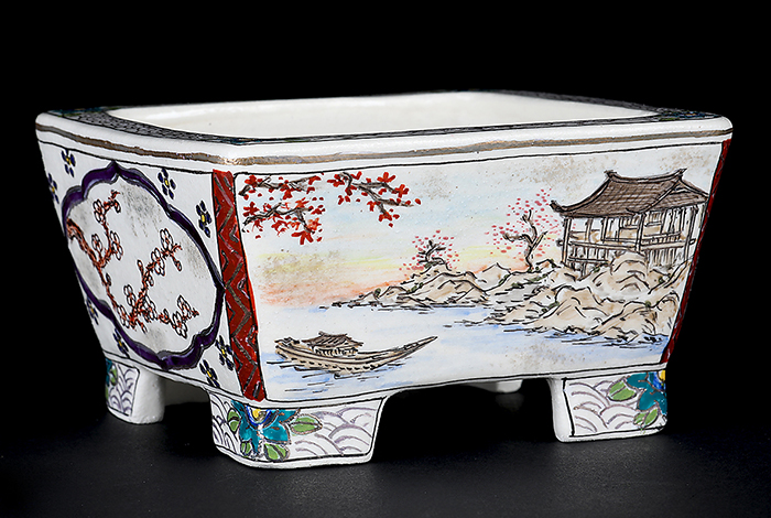 現在は京薩摩の作風は残しつつ、樹を植えることを意識した余白を残した絵付けに加えて、小品盆栽を引き立てる鉢型など独自のスタイルを確立するに至る。