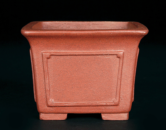 深さのある正方鉢。額面の意匠が施された格調高いデザインです。小品盆栽・ミニ盆栽の懸崖樹、半懸崖樹に最適です。