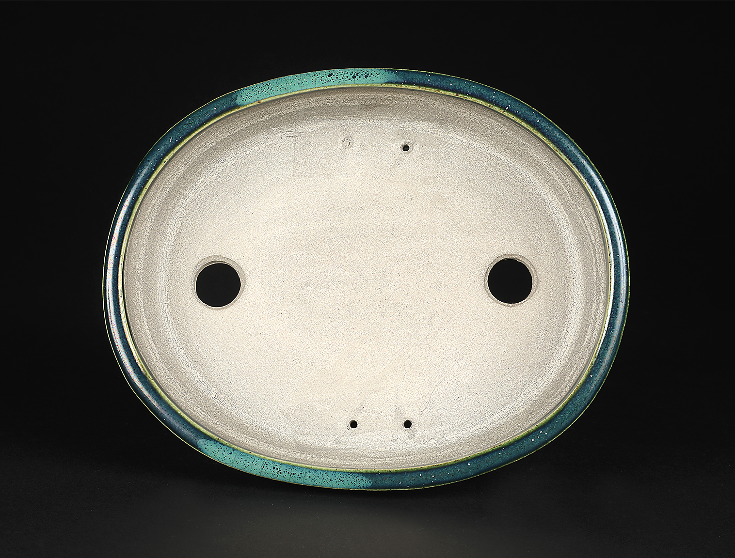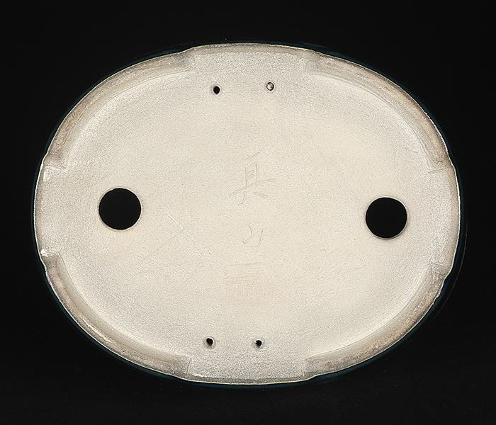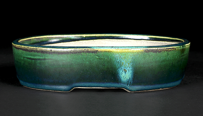 寺畑陶園得意の織部釉を駆使した作品。緑でも深みのある発色で使ってすぐ馴染む落ち着きのある色合いです。縁にワンポイントで施釉された青色もお洒落です。型はオーソドックスな切立型の楕円鉢ですがやや深さを持たせているので培養面で安心!使い勝手抜群です。中品・貴風に使えるサイズ感も魅力。