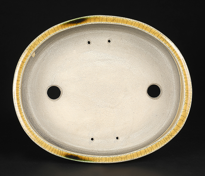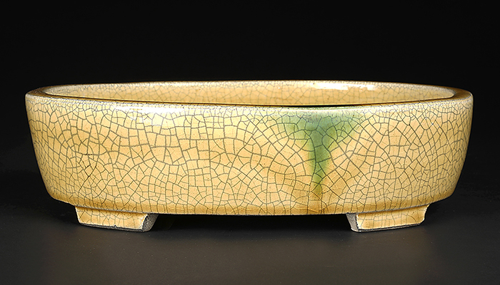 美濃・瀬戸の伝統技法黄瀬戸の落ち着いた発色に緑釉がワンポイントであしらわれたセンス溢れる逸品。型はオーソドックスな切立型の楕円鉢ですがやや深さを持たせているので培養面で安心!使い勝手抜群です。中品・貴風に使えるサイズ感も魅力。