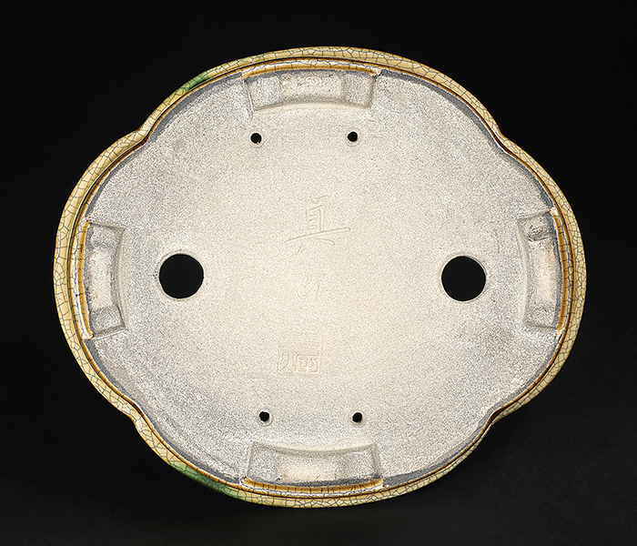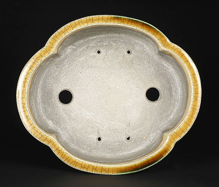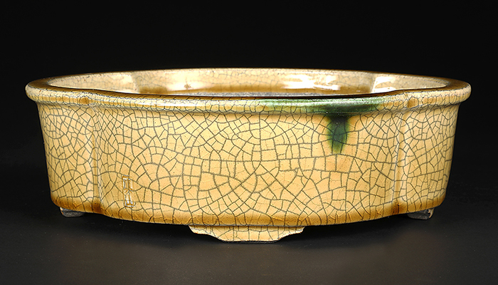 美濃・瀬戸の伝統技法黄瀬戸の落ち着いた発色に緑釉がワンポイントであしらわれたセンス溢れる逸品。型は重厚な中に柔らかさも備えた使い勝手抜群の木瓜式鉢。深さがあるので迫力のある樹を受け止めてくれます。中品・貴風に使えるサイズ感も魅力。