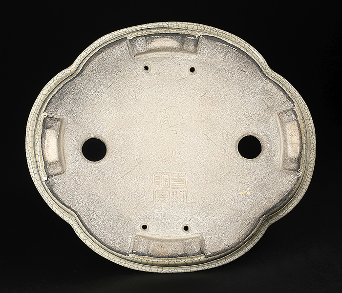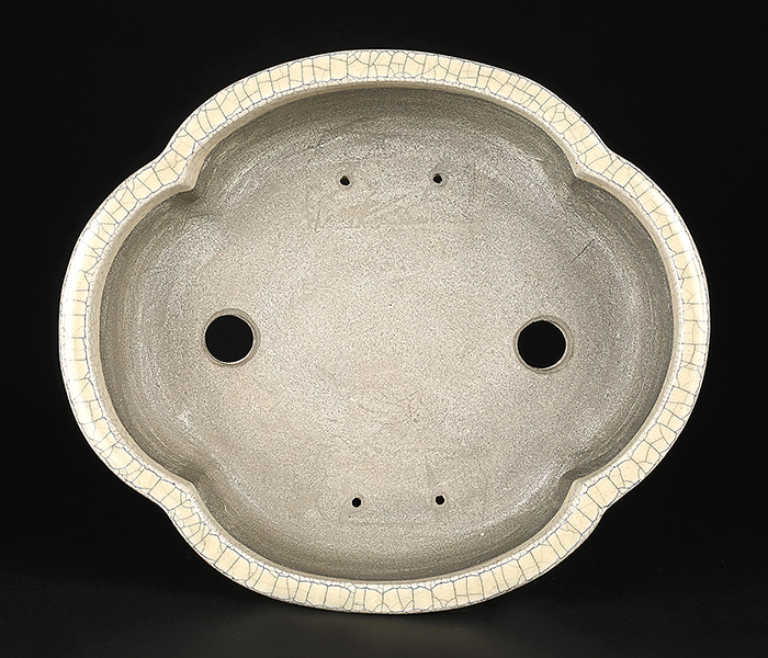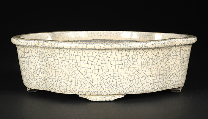 落ち着きのある発色の白釉で貫入が入ることで深い味わいを見せています。型は重厚な中に柔らかさも備えた使い勝手抜群の木瓜式鉢。深さがあるので迫力のある樹を受け止めてくれます。中品・貴風に使えるサイズ感も魅力。