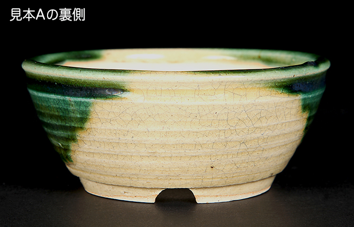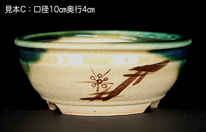 桃山時代に美濃地方で生まれた織部焼の皿などを手本に盆栽鉢に反映した英明得意の丸鉢。センス溢れる仕上がりは1点ものの価値があります。小品盆栽・ミニ盆栽・山野草に最適です。落款:燿