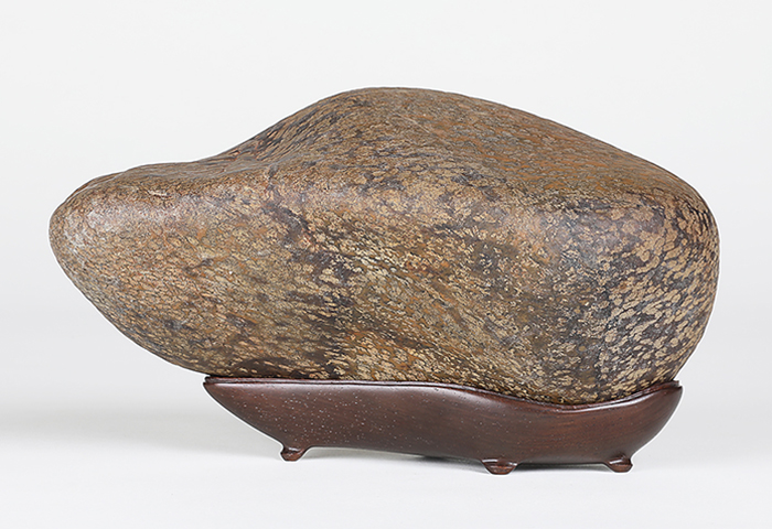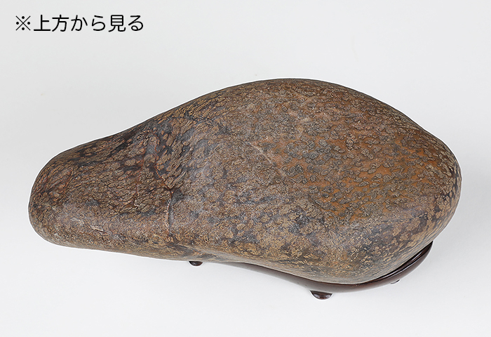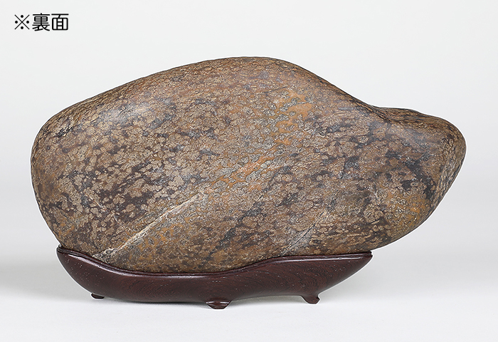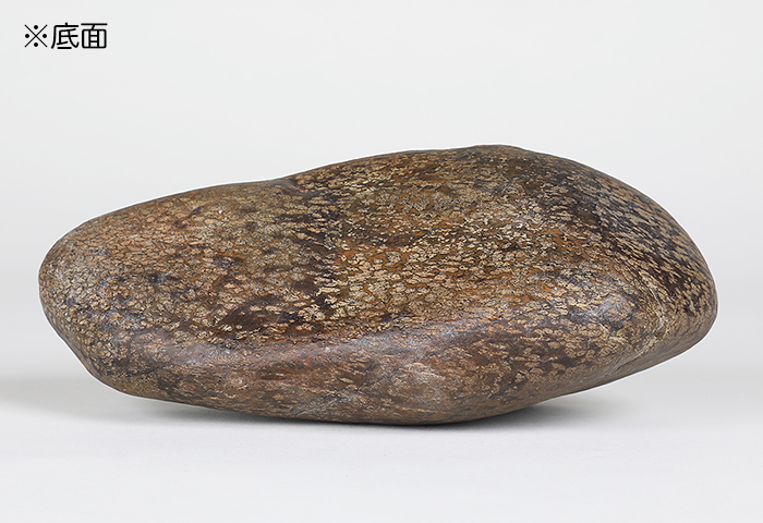 川ずれによる丸みをもった滑らかな石肌は時代を感じさせます。石肌全体にきめ細かく散りばめられた梨地肌が大変美しい。名石の産地として名高い瀬田川でもこのような美しい梨地を呈するものは少なく、貴重な一石と言えます。底はあまり手が入っている様子はなく、ウブもしくは自然処理されたものだと思われます。木箱付きで旧蔵者が大切に保管していたことが伺える一石です。