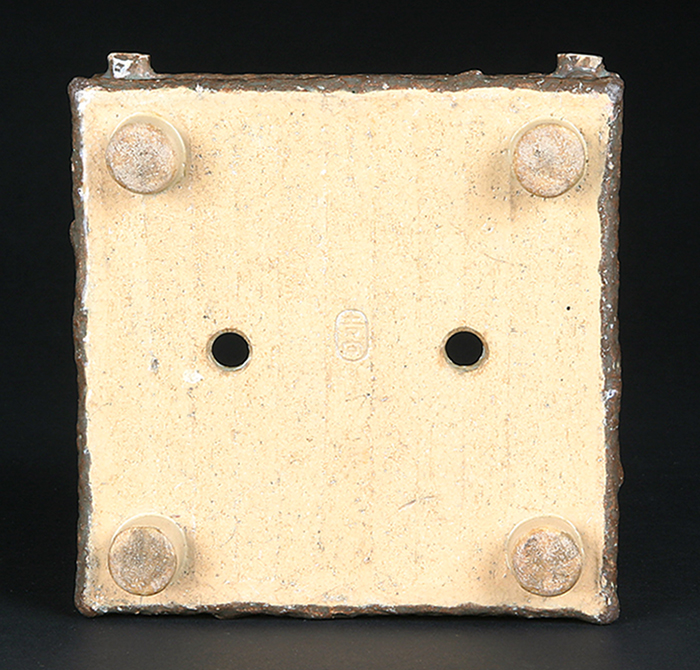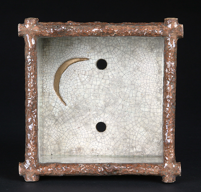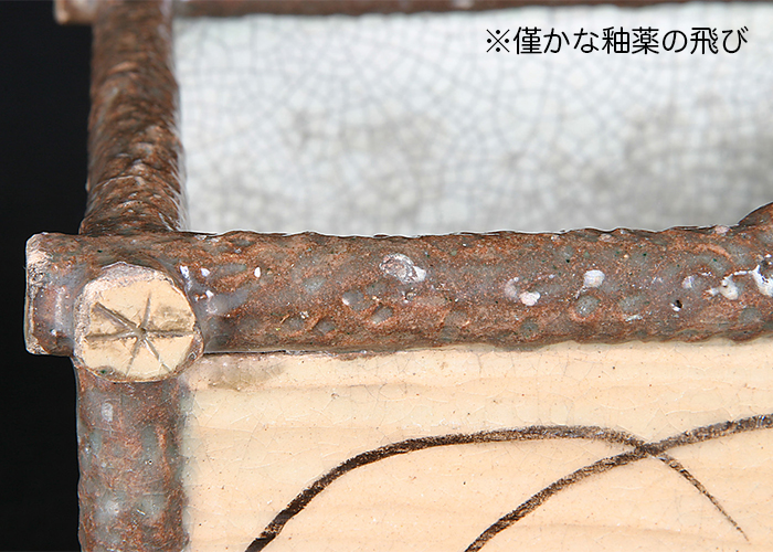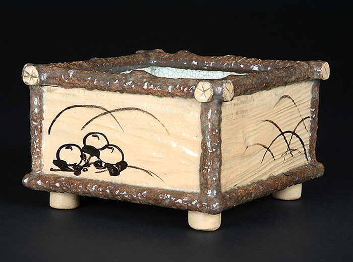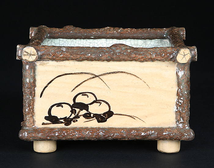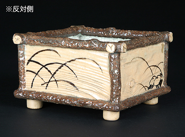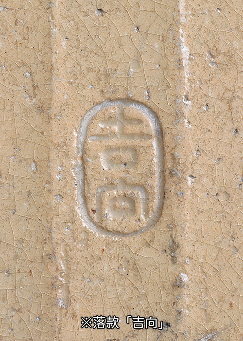 吉向焼は江戸時代、享和年間(1801~1804)に伊予大洲藩出身の戸田治兵衛が京に出て、楽家九代了入・初代清水六兵衛・仁阿弥道八・浅井周斎などの名人たちに作陶を学び、大阪十三村に筑窯しました。庭前の老松と生駒山にのぼる月にちなみ「十三軒松月」と号し、作陶に専念したのが起こりです。この作品は擬木を組んだような形状で四面に秋を思わせる洒落た絵付、そして内底に底面に三日月を描くという大変珍しく、そして面白い作品です。何代目の作かは不明ですが時代を見れば、かなり古いものだと思われます。鉢穴は後で開けれた可能性があります。鉢縁に薄い欠けと釉薬の欠けが数ヵ所ありますが古さを考えれば保存状態は良好と言えます。木箱付。落款:吉向。
