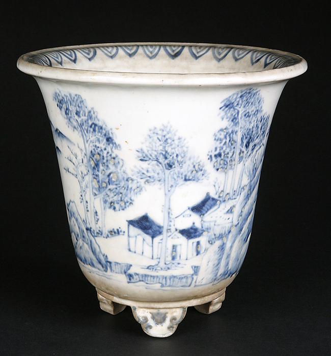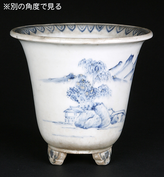 産地は定かではありませんが、おそらくは中国南京の古鉢だと思われます。余白を活かした牧歌的な絵付の構図と淡い筆致が味わい深い作品です。シャープな丸型もこの手の蘭鉢系では珍しいザインです。時代乗りから察して100年前後は経つ古いものだと思われます。古色感が素晴らしく樹を上品に引き立ててくれるでしょう。小さな薬飛びが見られますが、それすらもはや味と化しています。それ以外は目立った傷はなく保存状態は良好です。