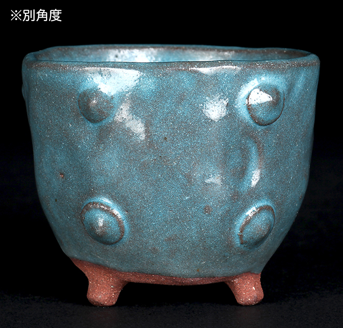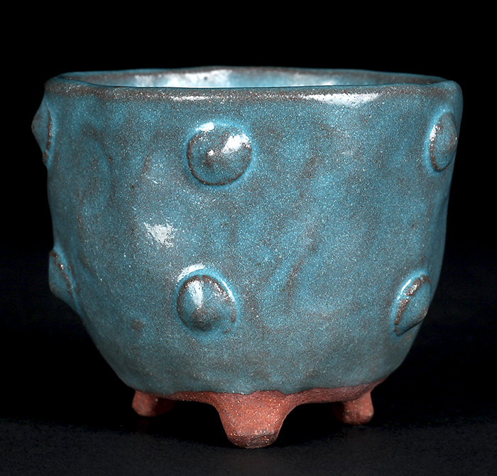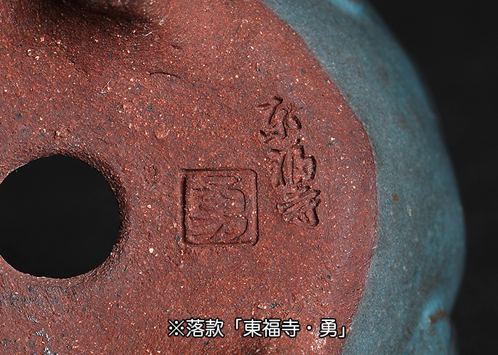 二代東福寺の作品。均釉の中でも水色のこの発色は初代が晩年に使っていたもので、色調が味わい深い。手びねり丸鉢に鋲打細工という形状が面白く、ミニの雑木盆栽や山野草に使うと映えるでしょう。目立った傷はなく保存状態は良好。落款:東福寺・勇