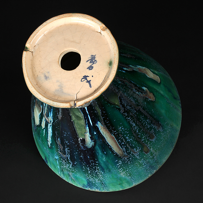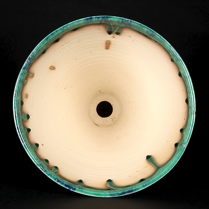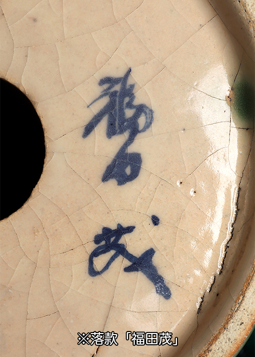 馬上で使う杯をモデルとした盆器には珍しい型で、モダンな植栽や飾りを楽しめる逸品。裏薬も施釉された丁寧な作りです。福茂の遊び心溢れた珍品です。足や縁から内縁にかけて制作時に出来た薄いカマ傷がありますが使用には問題ありません。落款:福田茂
