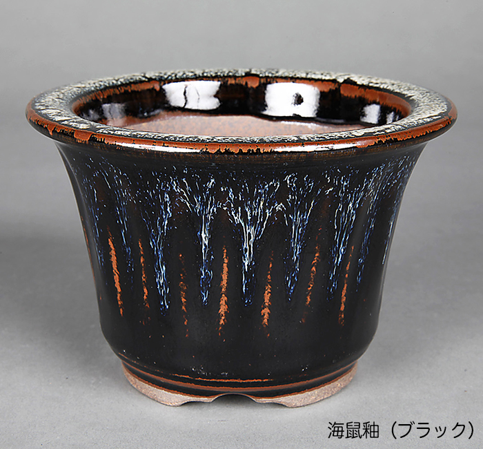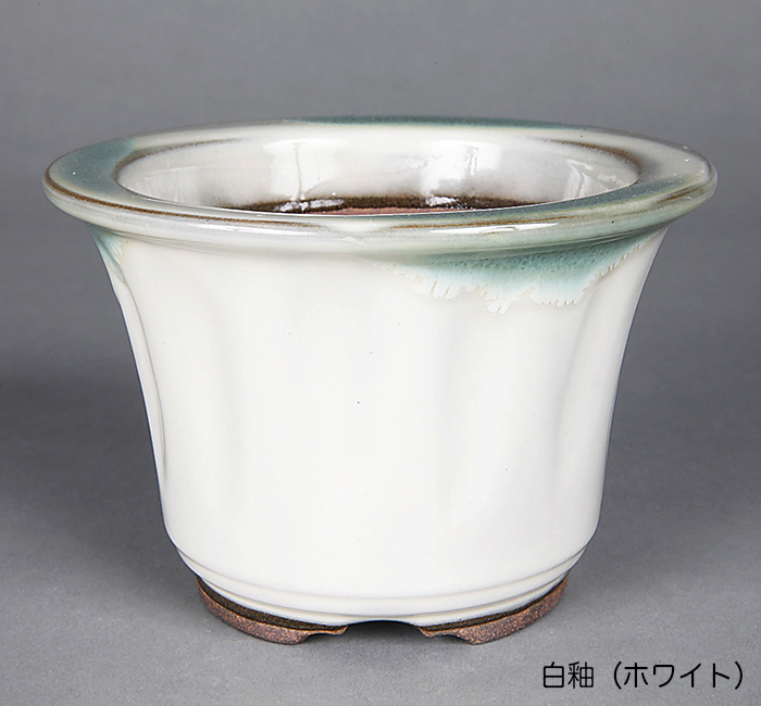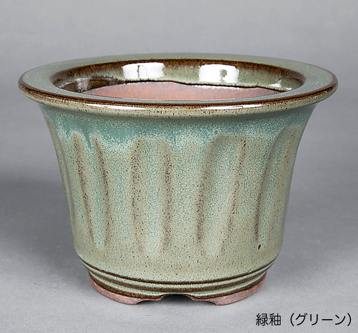 縦筋の意匠が粋なデザイン性豊かな丸鉢。大きめのサイズで本格的な小品盆栽や大株の山野草に最適です。釉薬は緑釉・海鼠釉・白釉の3色がございます。
