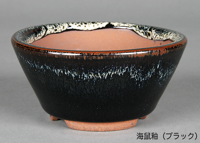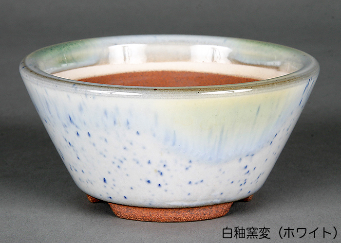 反型の美しいラインが魅力の丸鉢。バランスの良い型で本格的な小品盆栽や持ち込みの古い山野草の寄せ植えに最適です。釉薬は白釉窯変・辰砂釉・海鼠釉・白釉・緑釉の5色がございます。
