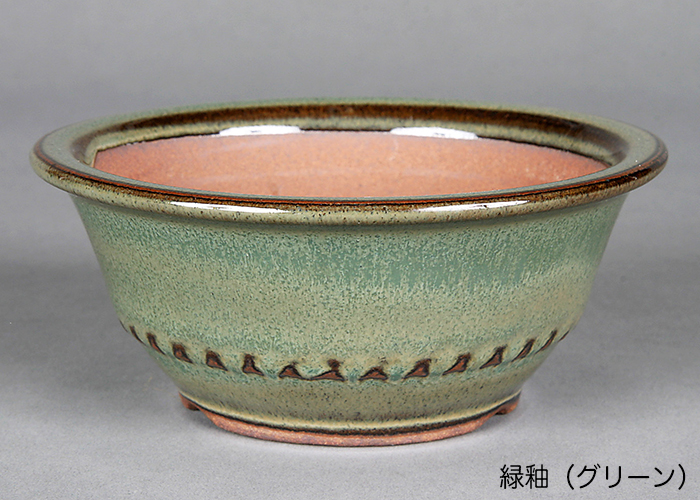 胴縄の意匠を施したデザイン性に富んだ丸鉢。椀型の優しい型は小品盆栽から山野草まで幅広く使えます。釉薬は白釉・緑釉・辰砂釉・海鼠釉の4色がございます。