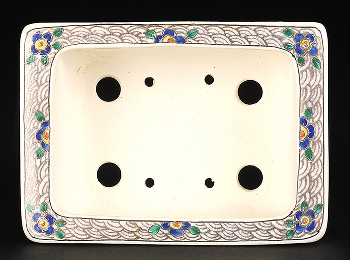 ボディ成型に関しては、以前から父親の茶陶製造を務めていたこともあり、タタラもロクロもお手の物。型を用いず完全手づくりでこなす。本焼きされた絵付け前のボディには下絵付けせず、透明釉を施釉。ベースとなる線画を描き焼成。彩色を得て焼成。そえて最終工程に金彩などによる装飾を加えて焼成と4度の窯入れを得て柳戸川浩山鉢が生み出される。