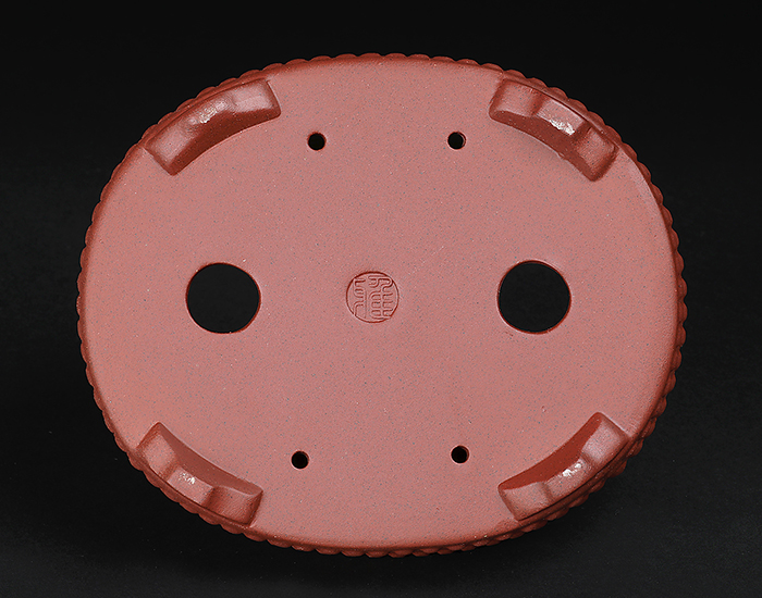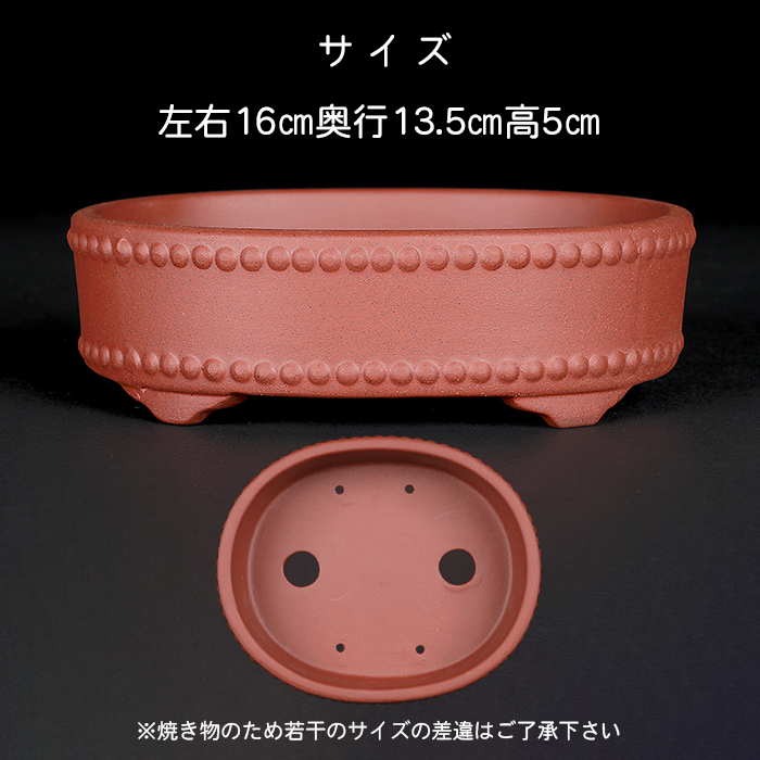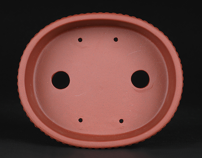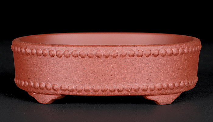 上下に鋲打の意匠が施された格調高いデザインの楕円鉢。本格的なサイズの小品盆栽に最適なサイズです。