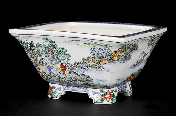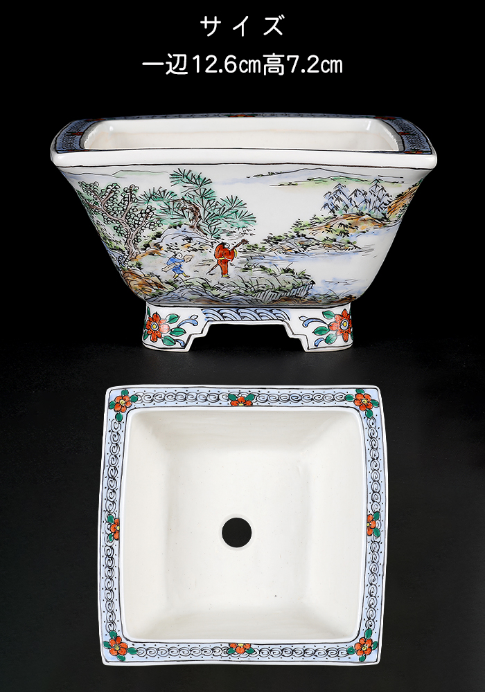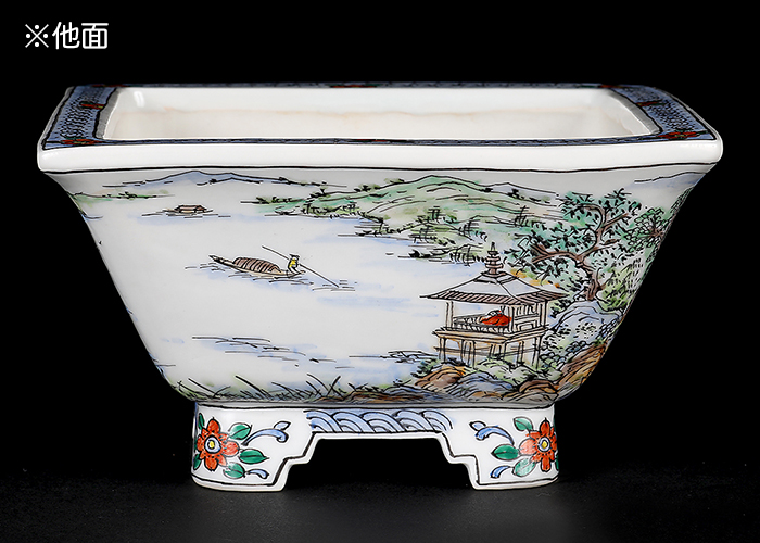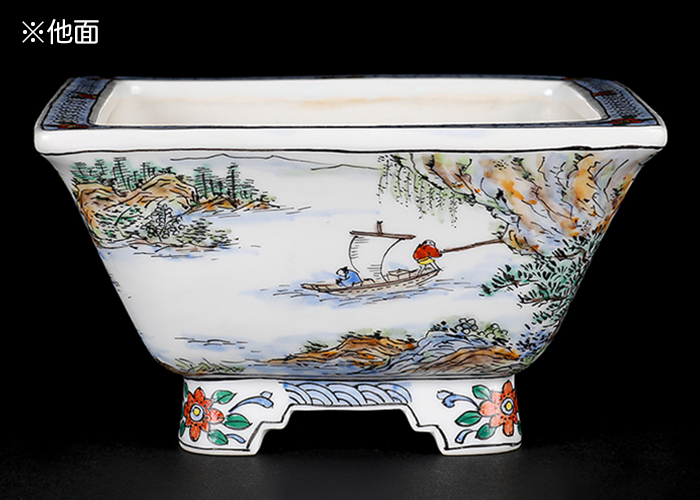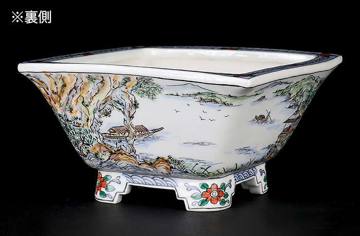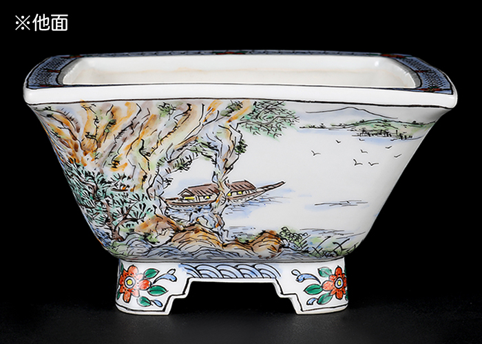近年は小品盆栽に使える長方鉢、木瓜式鉢などを中心に作陶。また得意のロクロ成型からの削り出しによる六角型の輪花縁といったオリジナルデザインも生み出しています。絵付けは涌泉が用いた山水や雲龍図などをベースにしていますが、五彩などは技術の向上により正泉独自の色彩を表現、国内のみならず海外でも高い人気を誇ります。