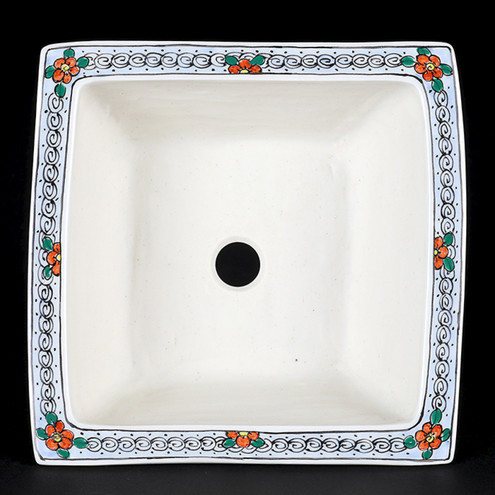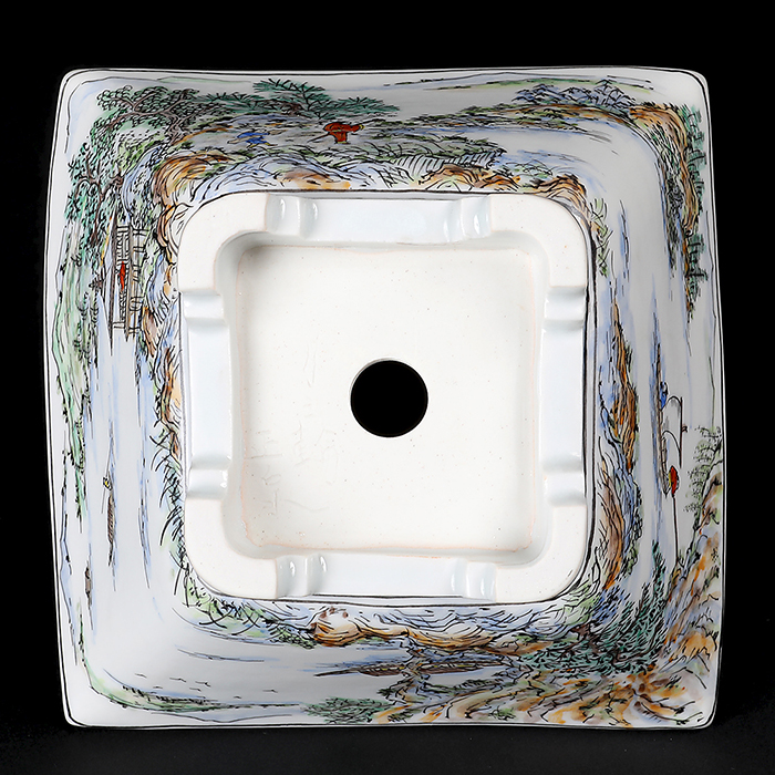 足元が引き締まった、洒落たデザインの正方鉢。四面を存分に使った水辺の景色は奥行感のある雄大な仕上がりです。小品盆栽に最適な寸法で懸崖、半懸崖樹に最適です。落款:月之輪正泉