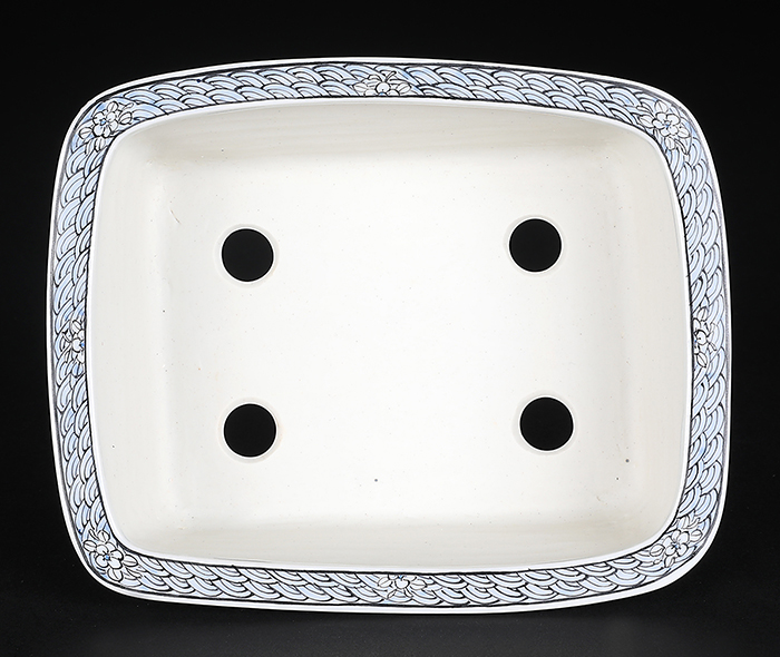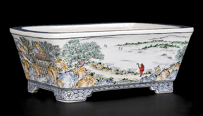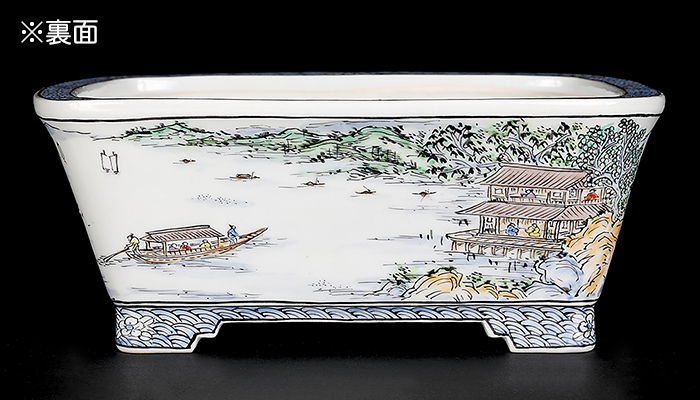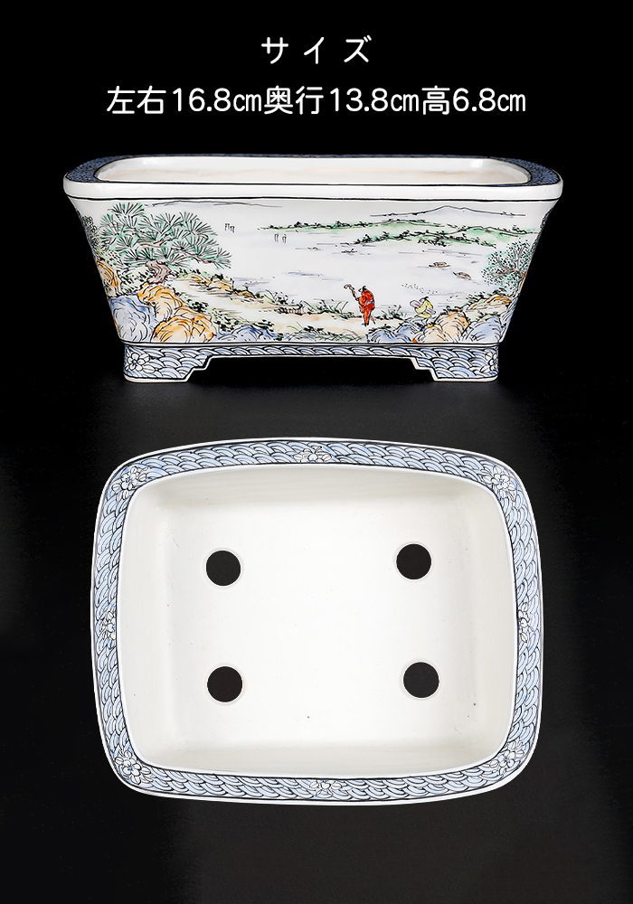 柔らかで深さのある長方鉢。サイズも良く、小品盆栽に幅広く使えます。しっかり書き込んだ部分と余白部分とのメリハリが利いた絵付けで、友の元を訪れる高士、そして水辺の景色が上手く調和した抜群の仕上がり井です。落款:月之輪正泉
