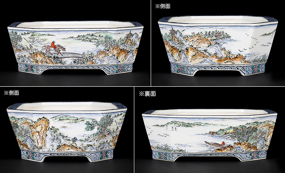 隅切のカッチリとした型で存在感抜群の長方鉢。友の元を訪ねる高士を描いた訪友図ですが四面をフルに活かした廻し絵は圧巻の一言。涌泉を彷彿させる色使い、奥行感のある雄大な景色と素晴らしい仕上がりです。落款:月之輪正泉
