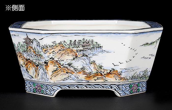 近年は小品盆栽に使える長方鉢、木瓜式鉢などを中心に作陶。また得意のロクロ成型からの削り出しによる六角型の輪花縁といったオリジナルデザインも生み出しています。絵付けは涌泉が用いた山水や雲龍図などをベースにしていますが、五彩などは技術の向上により正泉独自の色彩を表現、国内のみならず海外でも高い人気を誇ります。