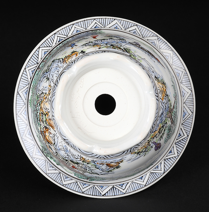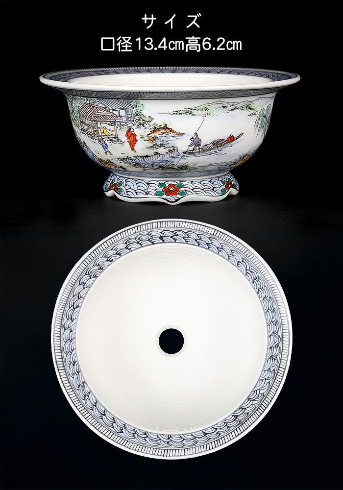 正泉が得意とするロクロを用いて仕上げた丸鉢。足の形状が凝っており存在感のある仕上がりとなっています。繊細な筆使いで描かれた訪友図は味わい深く、どの場面を正面に使うかは好み次第です。小品盆栽に最適な寸法ですが丸鉢なので下草なのにも使えるます。用途の広い一枚です。落款:月之輪正泉