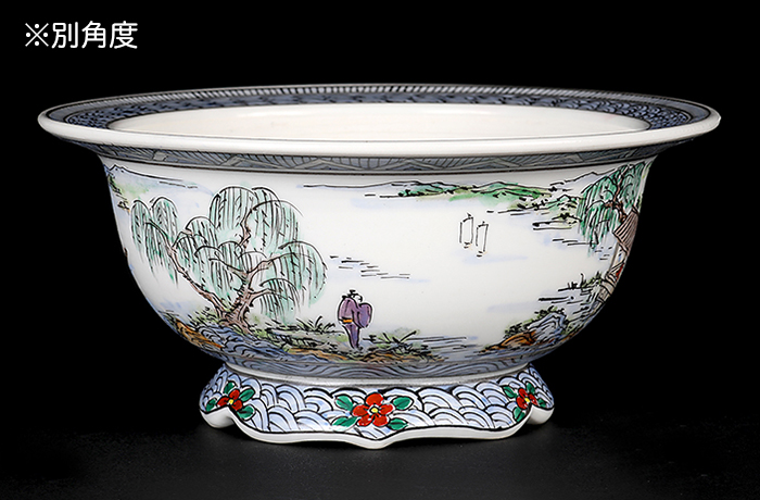 近年は小品盆栽に使える長方鉢、木瓜式鉢などを中心に作陶。また得意のロクロ成型からの削り出しによる六角型の輪花縁といったオリジナルデザインも生み出しています。絵付けは涌泉が用いた山水や雲龍図などをベースにしていますが、五彩などは技術の向上により正泉独自の色彩を表現、国内のみならず海外でも高い人気を誇ります。