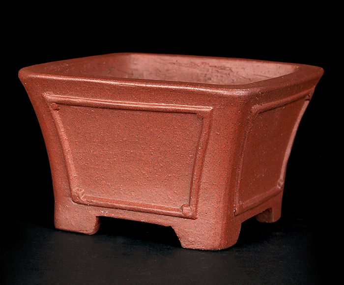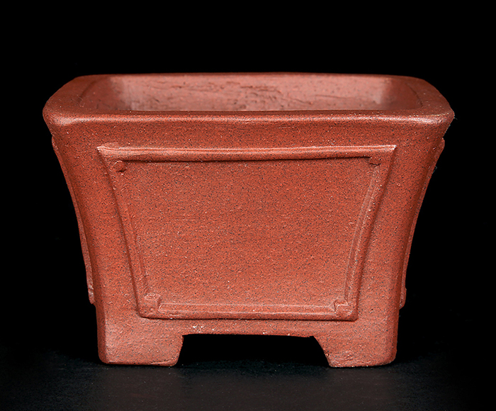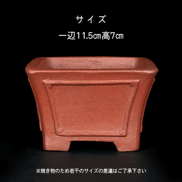 深さのある正方鉢。額面の意匠が施された格調高いデザインです。小品盆栽・ミニ盆栽の懸崖樹、半懸崖樹に最適です。