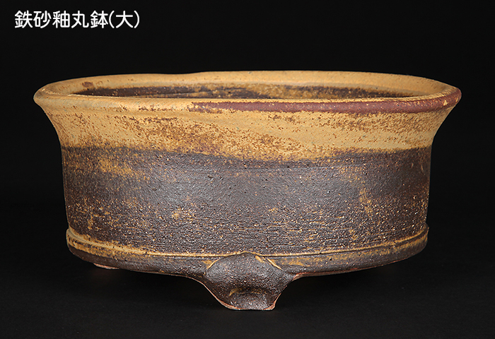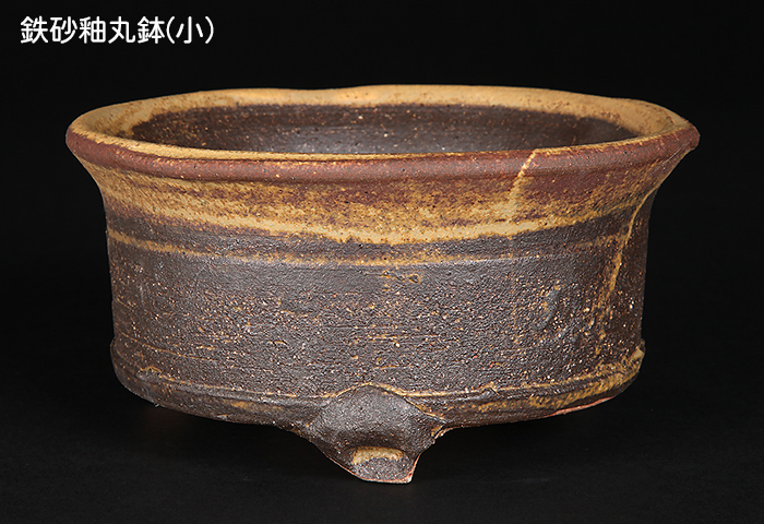 茶系の渋い色合いの釉薬に上から白系の釉薬を掛け分け風であしらった丸鉢。手びねりの温かみのあるフォルムとの調和も抜群。大小2点セットで草花や花木の単植え、あるいは寄せ植えにも使える用途の広いセットです。