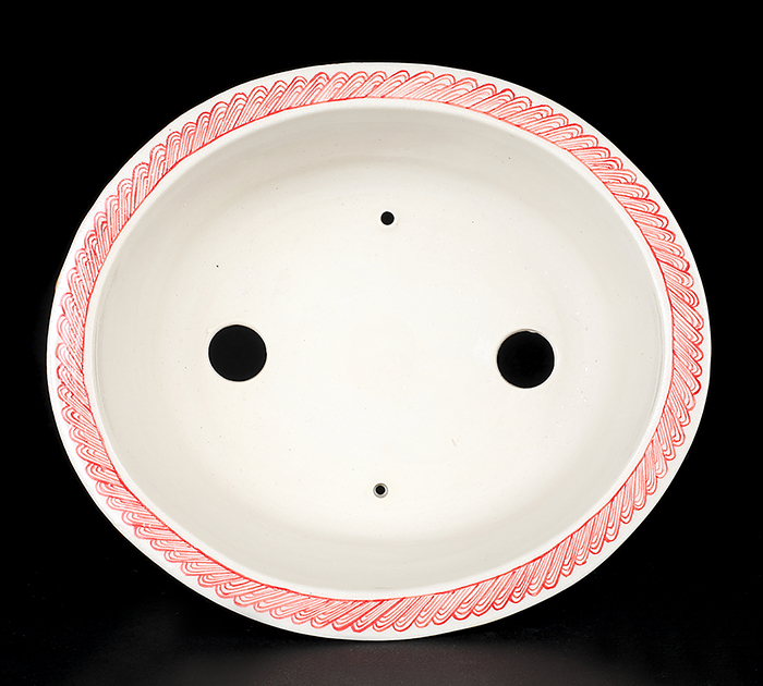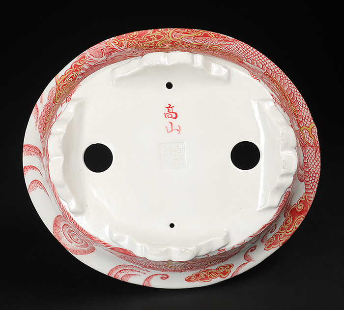 九谷峰山のボディに高山が絵付をした合作鉢。赤絵の意匠に、鮮やかな金の色彩が施された細工が美しい。豪快に描かれた龍の図案も素晴らしい。本格的な小品盆栽に使えるサイズも魅力です。落款:高山・九谷峰山