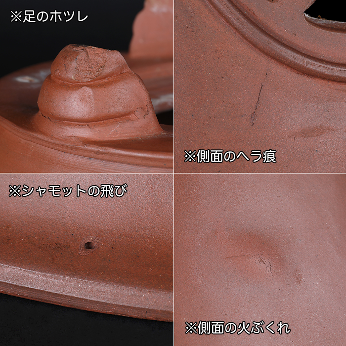 著名愛好家が40年以上前に中国・宜興にて特注で作らせたという貴重品。滑らかな朱泥の土目に透彫の文様が入った気品溢れる仕上がりです。足の形状にもこだわりが見て取れるデザイン性に富んだ作品です。使い込みによる時代感も申し分ない逸品。シャモットの飛びやヘラ痕、火膨れの他、足にホツレはありますが使用には問題ありません。落款あり