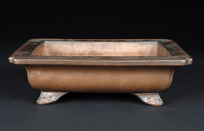 子林古型と言われる、どっしりとした型と格調高いデザインは振新厰製の定番ですが、深さを抑えたこのデザインは大変珍しい。中品鉢が多いこの手の鉢で貴風クラスの小振りなサイズも大変希少。きめ細かな土目にチョコレート色の土色が美しく、その上から抜群の時代乗りを見せる逸品。まさに実用名鉢と言えるでしょう。目立った傷はなく保存状態は良好。落款:振新厰製