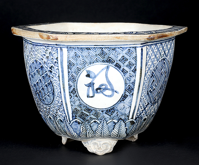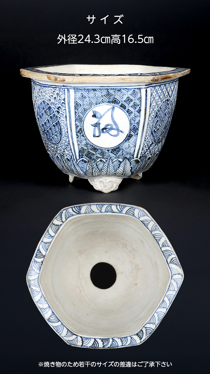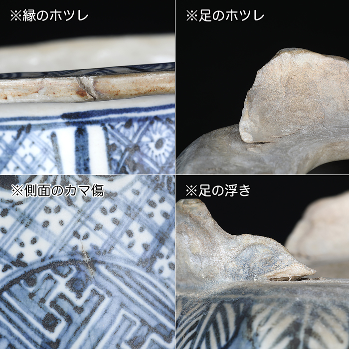 落款が入っているが判読が難しく、陶工や窯元などの詳細は不明。おそらくは100年以上前に焼成された京焼と思われます。細やかな文様と吉祥文字の意匠が上品な仕上がりを見せ、時代乗りも申し分ありません。使い勝手の良い寸法も魅力。角や足に小さなホツレと足の付け根にカマ傷ありますが古さを考えれば保存状態は良好です。落款あり。