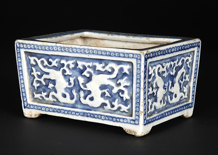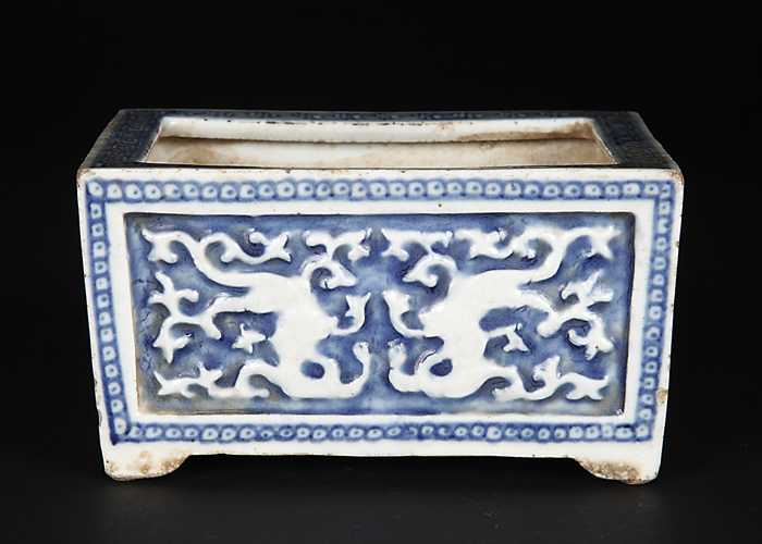 額面の中に浮彫細工が施された、非常に珍しい広東鉢。均釉と白釉のコトンラストも大変美しく、広東鉢としては群を抜く仕上がりを見せています。約二百年前に焼成されたものと思われ、長年の継承による時代感が最高の風合いを醸し出している。小品サイズではあるが抜群の存在感を放つ珍品にして名品。縁や側面などに軽微なホツレや、側面にごく薄い薬ニュウなどがあるが、使用には全く問題ありません。