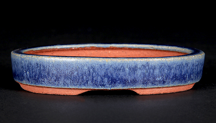 燿山譲りのマット(テカリを抑えた発色)系の瑠璃釉は渋みがあり、落ち着いた仕上がりを見せています。白の斑紋が浮かぶ窯変は味わい豊かです。オーソドックスな型だけに使い勝手は抜群。小品盆栽・ミニ盆栽に最適です。