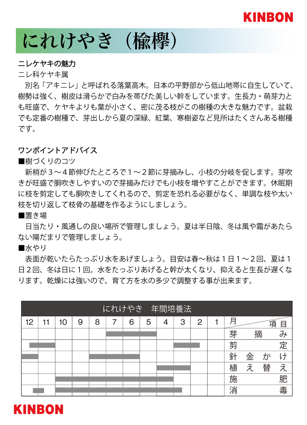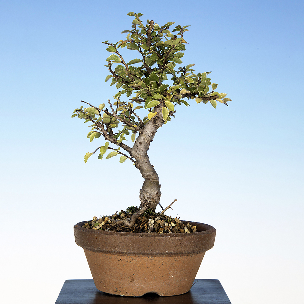 別名「アキニレ」と呼ばれる落葉高木。日本の平野部から低山地帯に自生していて、樹勢は強く、樹皮は滑らかで白みを帯びた美しい幹をしています。生長力・萌芽力とも旺盛で、ケヤキよりも葉が小さく、密に茂る枝がこの樹種の大きな魅力です。盆栽でも定番の樹種で、芽出しから夏の深緑、紅葉、寒樹姿など見所はたくさんある樹種です。