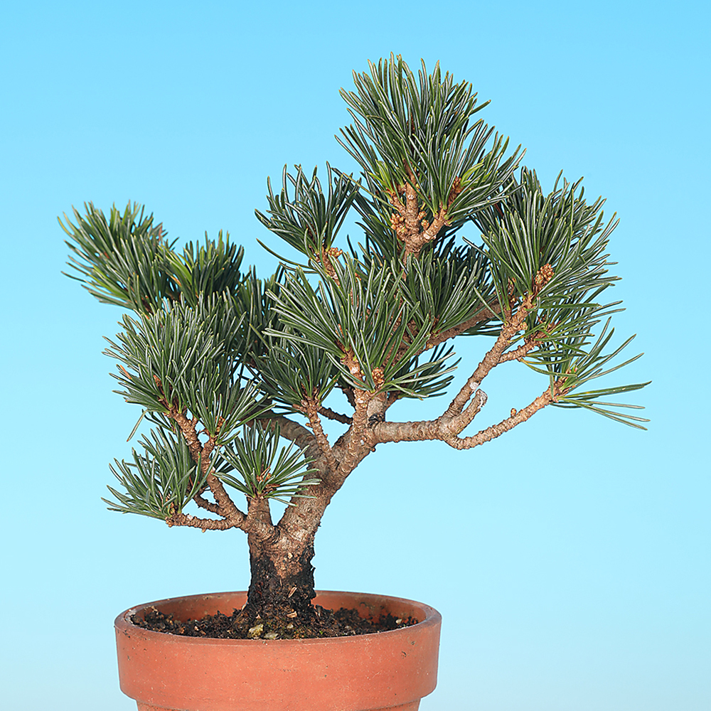 誰もが知っている「松」の代表格。丈夫な性質と優美でおだやかな姿ながら、盆栽樹種の中でも一、二を争う人気樹種です。五葉松の魅力はなんと言ってもその美しい常緑の葉にあります。短小で密に生じる葉はあらゆる樹形に調和し、様々な風趣を醸し出します。存在感たっぷりの重厚な雰囲気、枯淡の味に満ちた老木の風情など、樹形展開の幅広さが大きな魅力です。