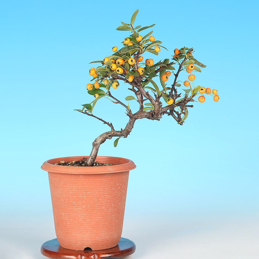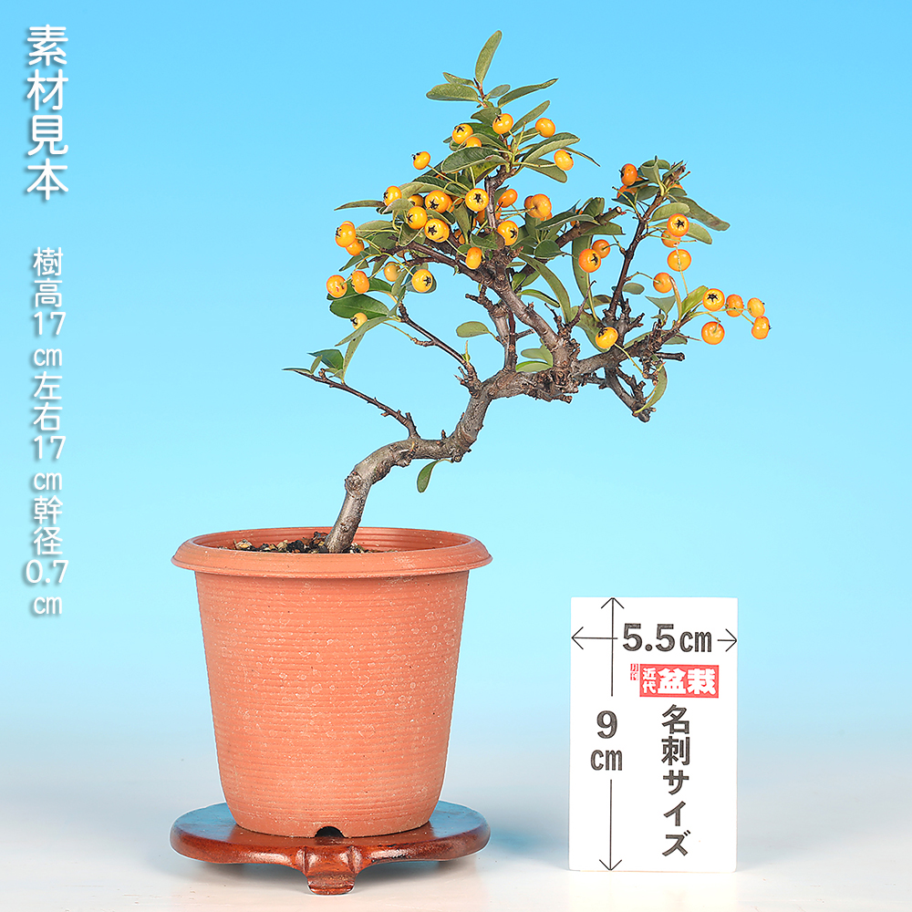 挿し木からしっかりと幹に模様をつけられた黄実のピラカンサです。枝位置もきちんと考えられており、今後の樹づくりが楽な素材です。プラ鉢入。