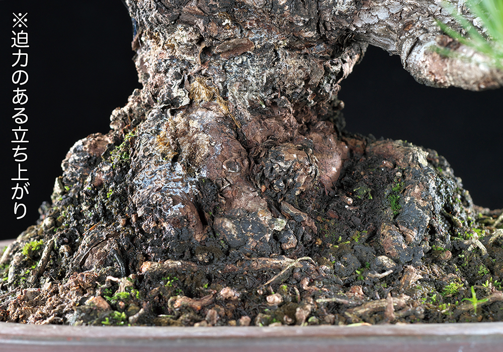 五葉松「桃山」は那須系の品種とされ、深青緑色の鮮やかな葉色と、短く締まった葉性の良さが魅力である。小品〜貴風クラスの寸法でこれほどの古色と時代感を有する樹は貴重。低い位置から出る一の枝と樹冠部とのバランスも素晴らしく、貴風飾りの主木や、中品飾りの添えとして大舞台に挑戦することも夢ではない。