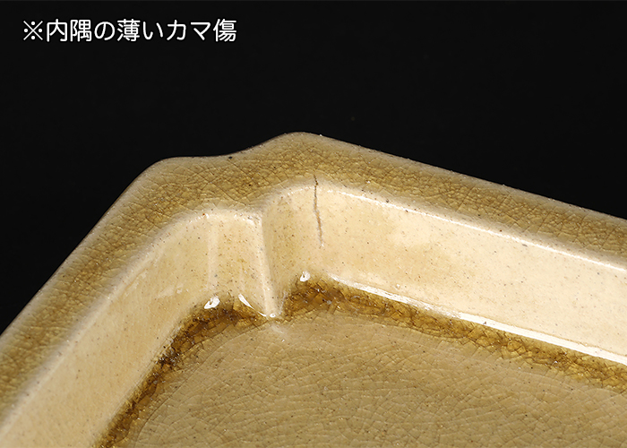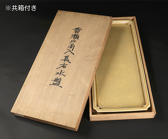鮮やかな黄瀬戸釉の色彩が美しい水盤。間口が広い短冊型の形状で、遠山石など雄大な景色を表現する水石と合わせるとよく映える。裏薬を施された逸品。内側に小さな薬カマあり。共箱付。落款:九輪自造