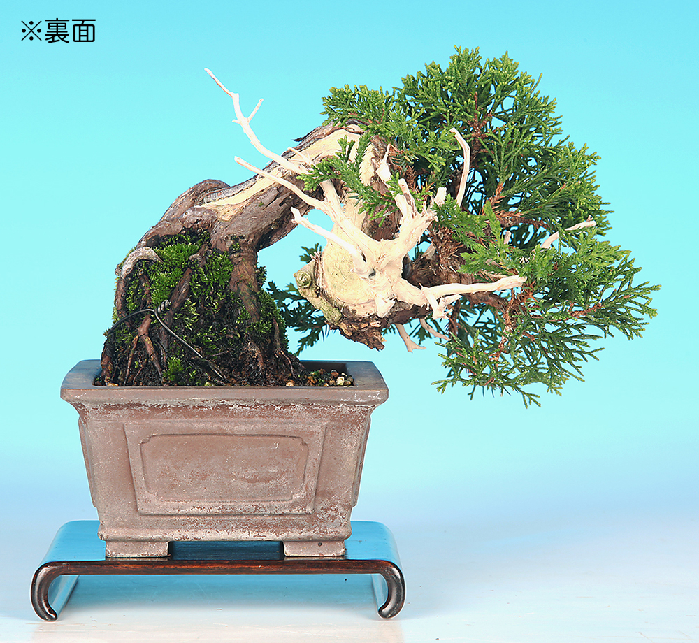 植え付け角度の変更でせり上がったと思われる立ち上がりが野趣を感じさせる。上部で屈曲するシャリ幹も迫力があり、厳しい自生環境に生きる真柏の生命力の強さが再現された逸品。