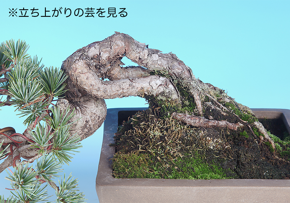 せり上がった根芸にまで時代が乗っており、懸崖樹形独特の厳しさを見所とする五葉松。短く締まった葉性の美しさも魅力である。