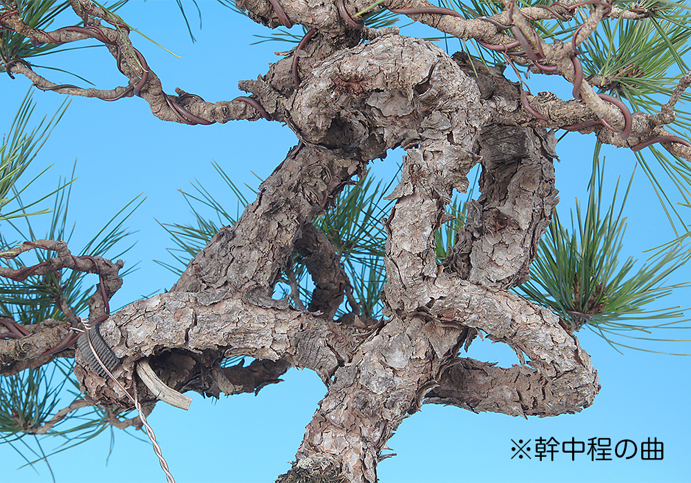 大きくループする幹模様が個性的な赤松。現状は幹模様に添わせて枝を置いて模様木樹形にまとめられているが、樹形構想次第ではさらなる樹格向上も期待できる。