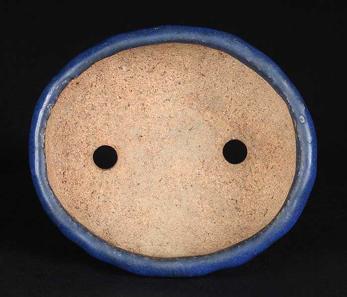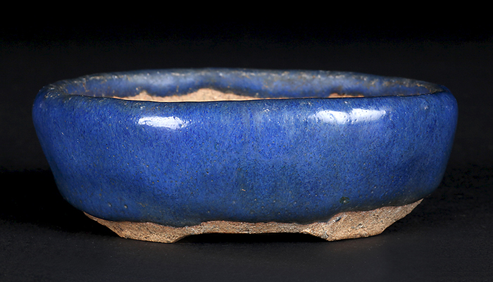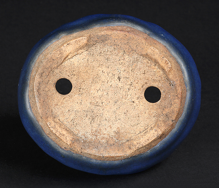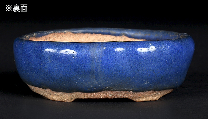 本器のような手捻りによるざっくりとした形成が温かみを漂わせ、樹を植栽した時に抜群の鉢映りを見せるのが東福寺盆器の魅力です。瑠璃釉の深みのある色合いに使い込みによる古色感が相まって抜群の味わいを見せる逸品。奥行があるので小品、ミニ盆栽はもちろん、草物にも最適です。目立った傷はなく保存状態は良好。落款:東福寺