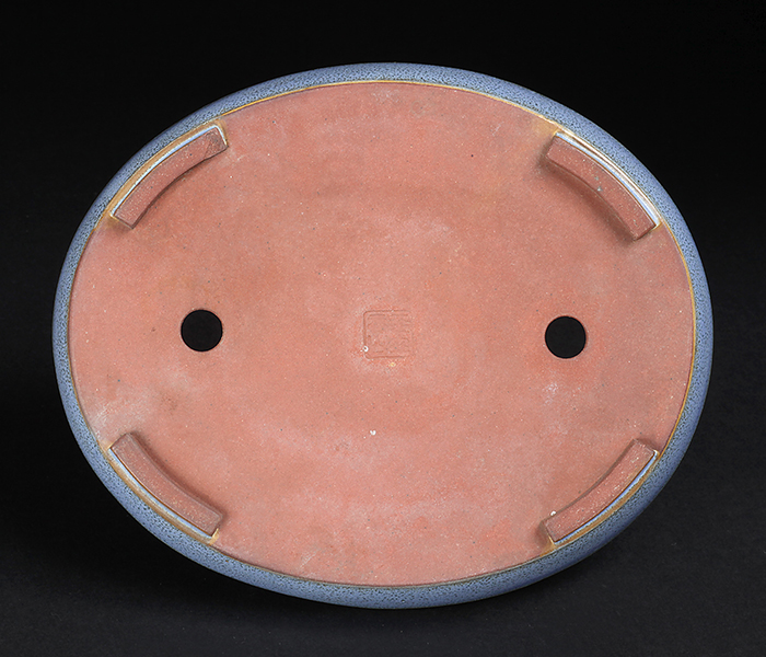 均釉は香山がこだわった釉薬の一つ。吹墨の手法で釉掛けされたものか、呂均釉のような釉紋が浮かび上がった美しい作品です。シャープなデザインはカミソリ香山の異名通りの仕上がり。浅手で奥行が広く取られた形状は根張りのある雑木盆栽に最適です。目立った傷はなく保存状態は良好。落款:平安香山