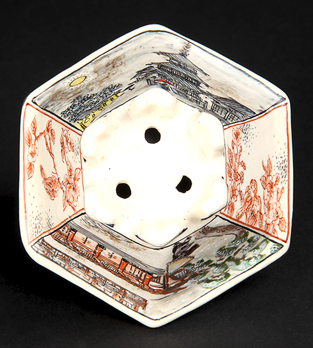 六面のうち、二面を使った風景描写が表裏に時施されており、残る二面は赤絵花鳥図という構成。ミニ盆栽の他、下草使いにも最適。